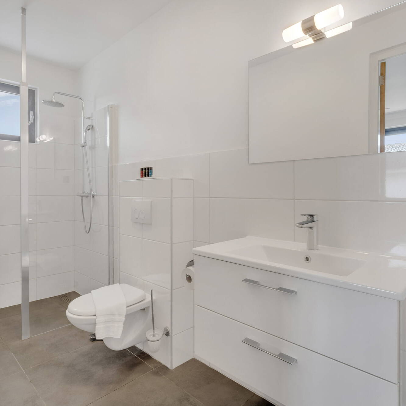 Beide slaapkamers zijn direct verbonden aan een badkamer en suite, uitgerust met een douche, wastafel en toilet.